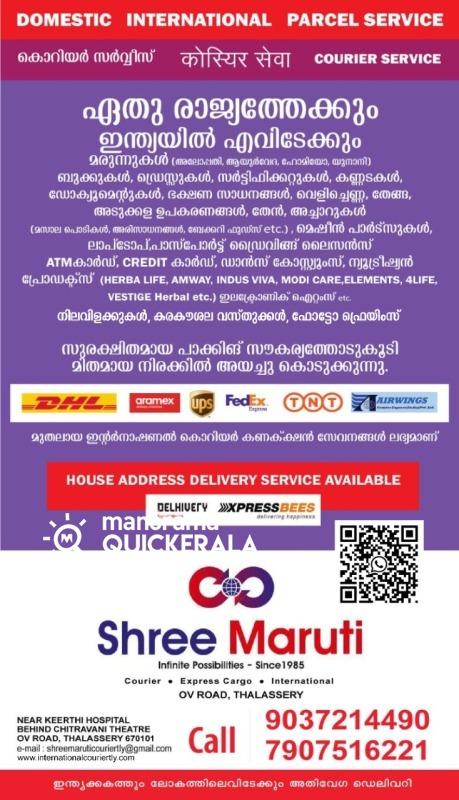 ഇന്ത്യയിൽ എവിടേക്കും, ഏതു രാജ്യത്തെക്കും മരുന്നുകൾ( അലോപ്പതി, ആയുർവേദം , ഹോമിയോ ),ന്യൂട്രിഷ്യൻ പ്രോഡക്ടസ് (HERBALIFE, AMWAY, INDUS VIVA, MODICARE, ELEMENTS, 4LIFE,VESTIGE), ബുക്കുകൾ, ഡ്രെസ്സുകൾ, സർട്ടിഫിക്കറ്റുകൾ, കണ്ണടകൾ, ഡോക്യൂമെന്റുകൾ, ഭക്ഷണ സാധനങ്ങൾ(മസാല പൊടികൾ, അരിസാധനങ്ങൾ, ബേക്കറി ഫുഡ്സ്, വെളിച്ചെണ്ണ, തേങ്ങ,etc) , സുഗന്ധവ്യഞ്ജനങ്ങൾ,മെഷീൻ പാർട്സുകൾ, ലാപ്ടോപ്,പാസ്പോർട്ട്, ഇലക്ട്രോണിക് ഐറ്റംസ് etc പാക്കിങ് സൗകര്യത്തോട് കൂടി മിതമായ നിരക്കിൽ അയച്ചു കൊടുക്കുന്നു.