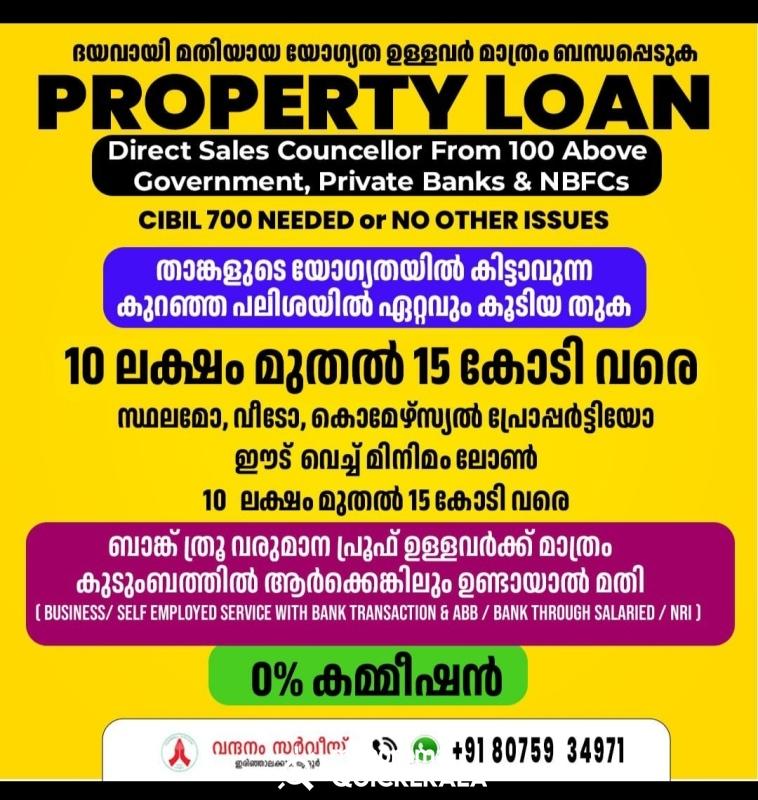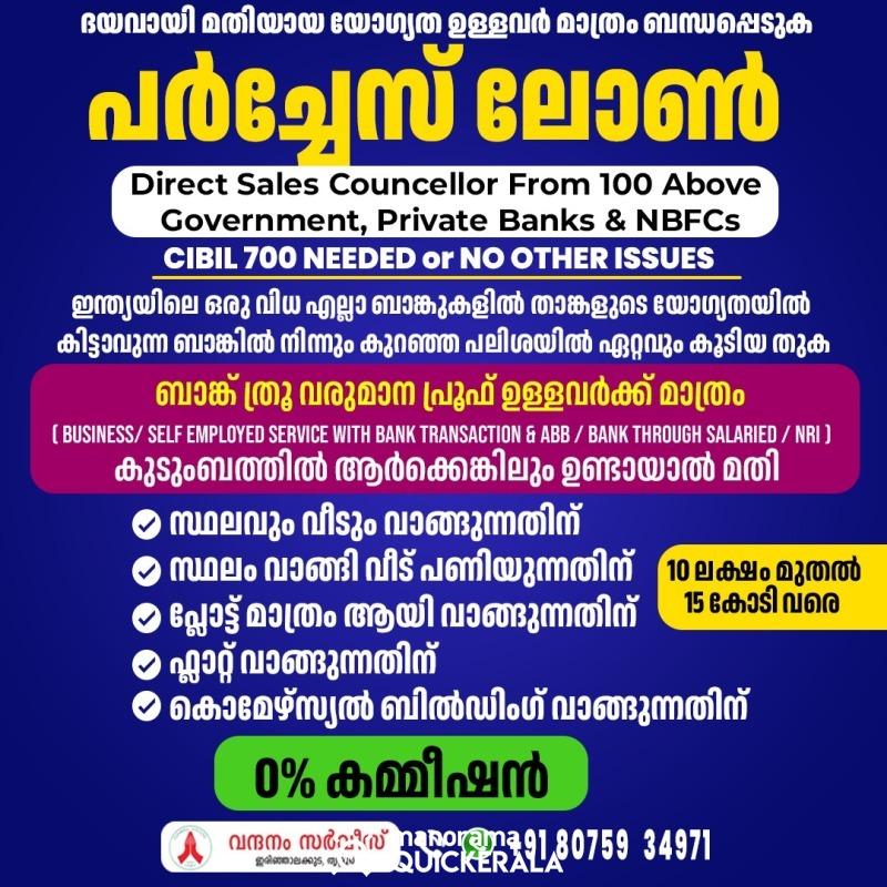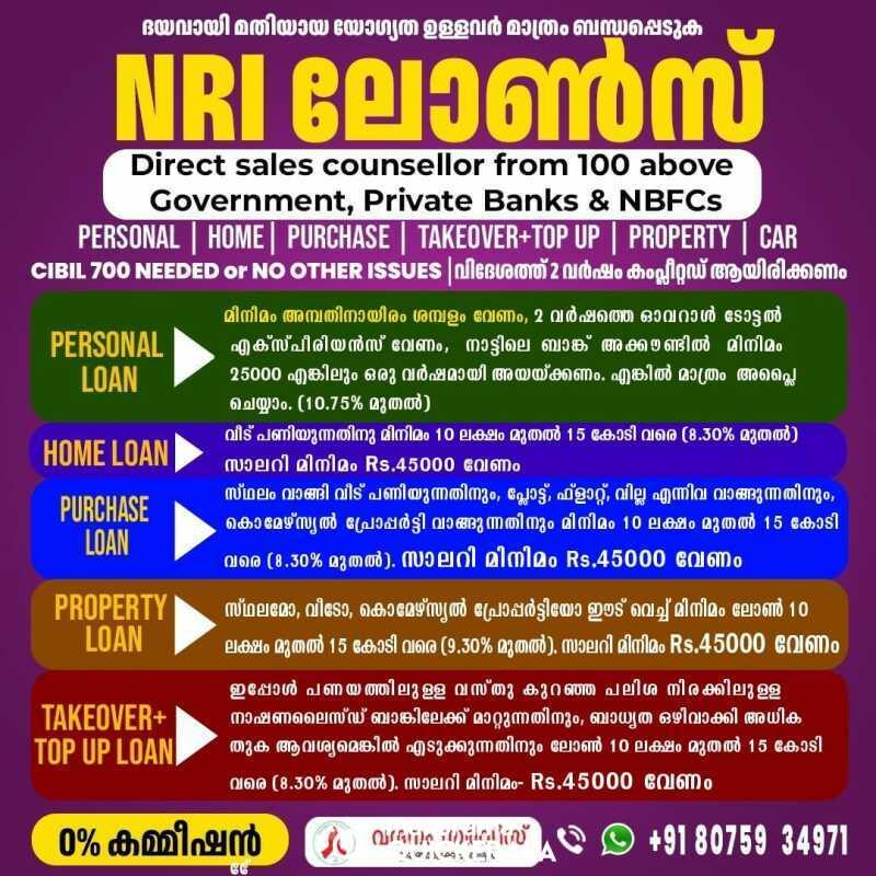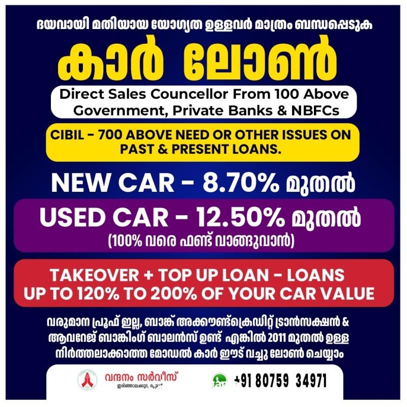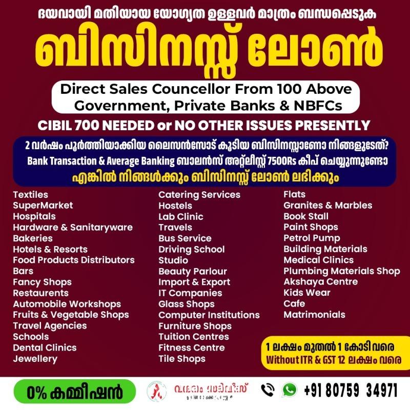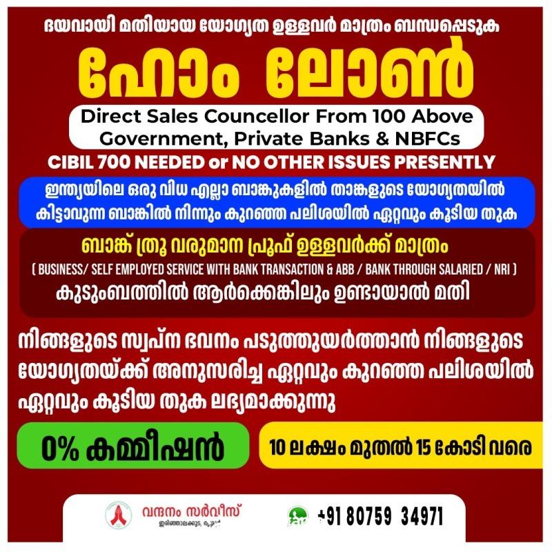 ധാരാളം ലേറ്റ് ഡേറ്റ് ലോൺ പേയ്മെന്റ് വരുത്തിയവർക്ക് ലോൺ 90% ഉം കിട്ടുകയില്ല, ) + സിബിൽ സ്കോർ and income പ്രൂഫ് ഉള്ള കസ്റ്റമർ ആണ് ഞങ്ങൾക്ക് വേണ്ടത് അല്ലാത്ത, ഇല്ലാത്ത, writeoff loan, settlement വരുത്തിയിട്ടുള്ള ഉള്ള വ്യക്തികൾ, suite ഫയൽ ഉള്ള വ്യക്തികൾ ദയവ് ചെയ്തു ഞങ്ങളെ വിളിക്കേണ്ട, ഞങ്ങളെ കൊണ്ട് ഒന്നും ചെയ്യുവാൻ സാധിക്കില്ല.